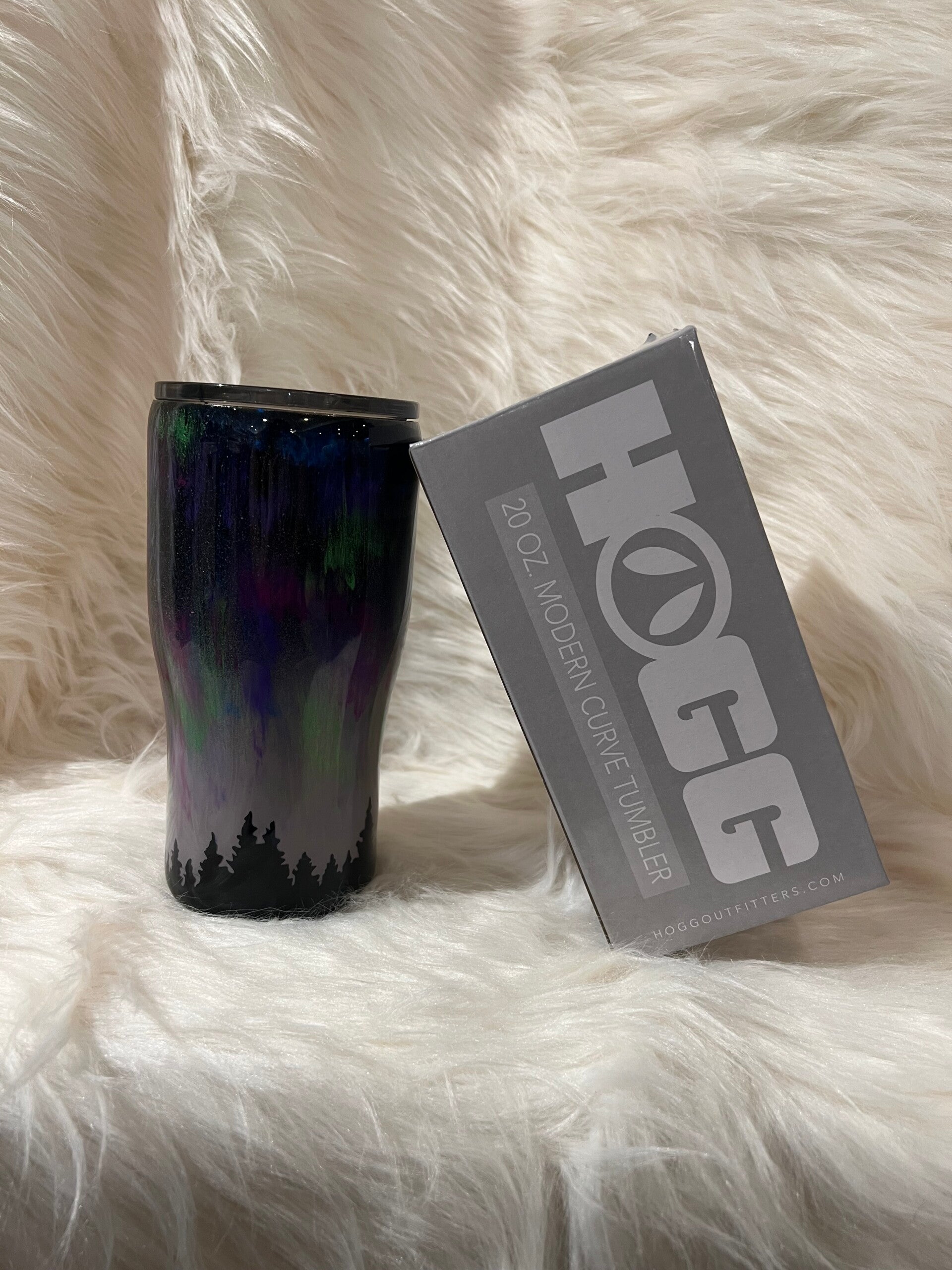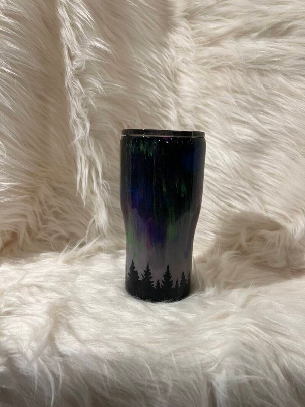 Gorgeous 20oz modern curve tumbler. Micas used for northern lights effect and a tree line decal.