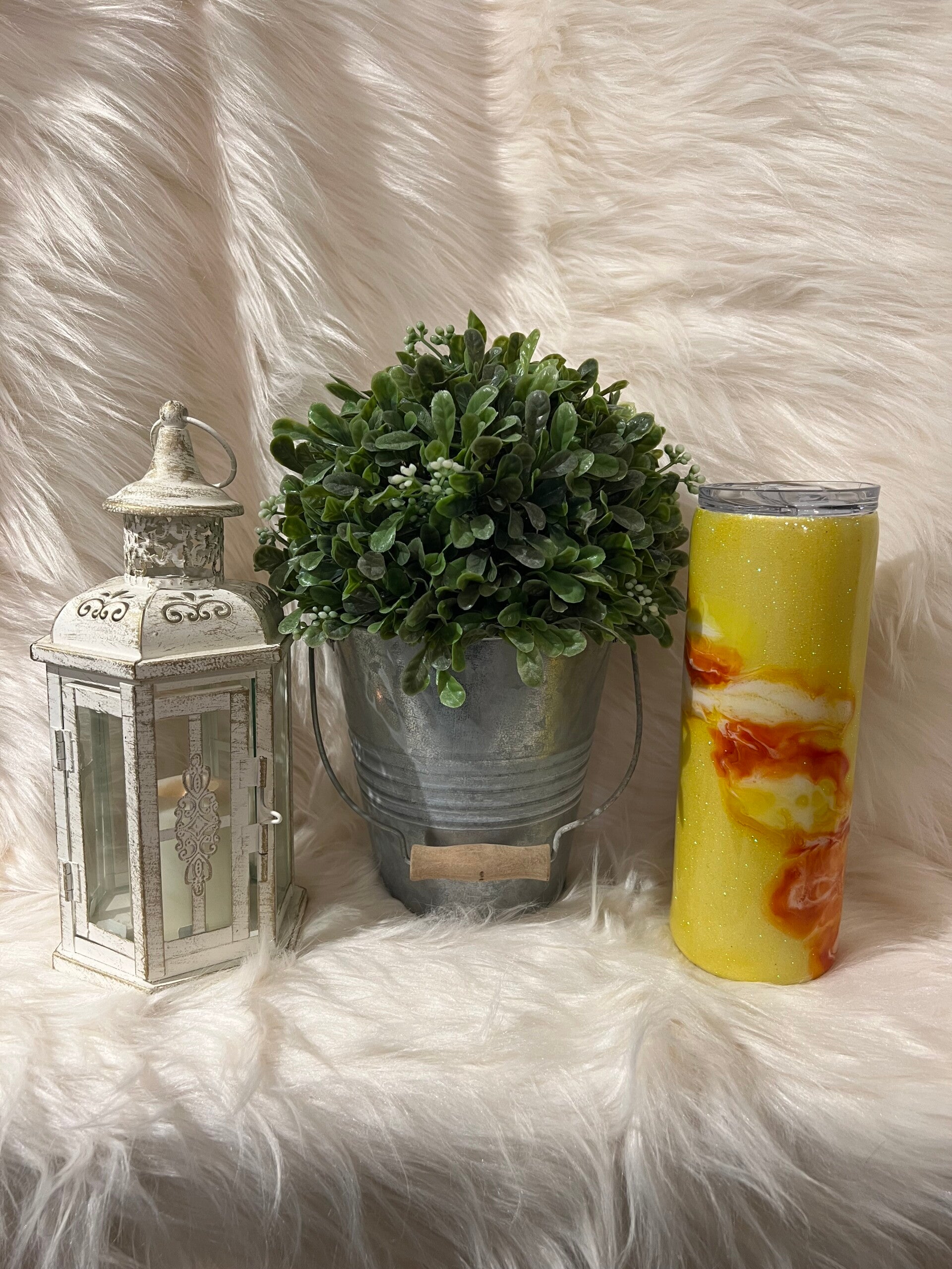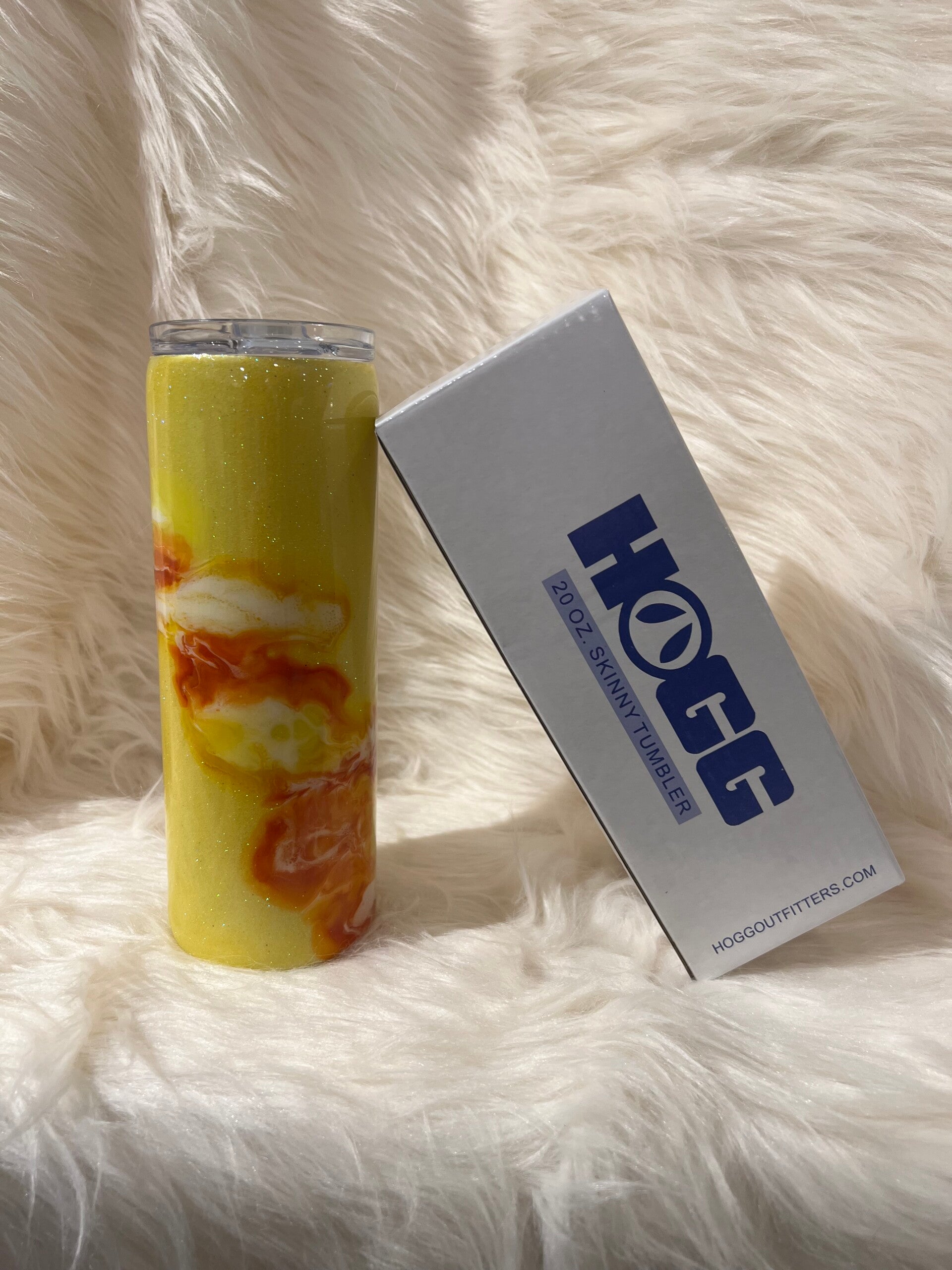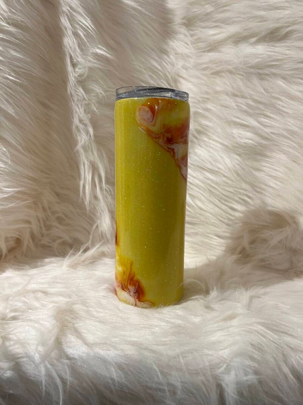 20oz skinny straight tumbler with full yellow glitter and a twisted yellow and orange ink swirl.