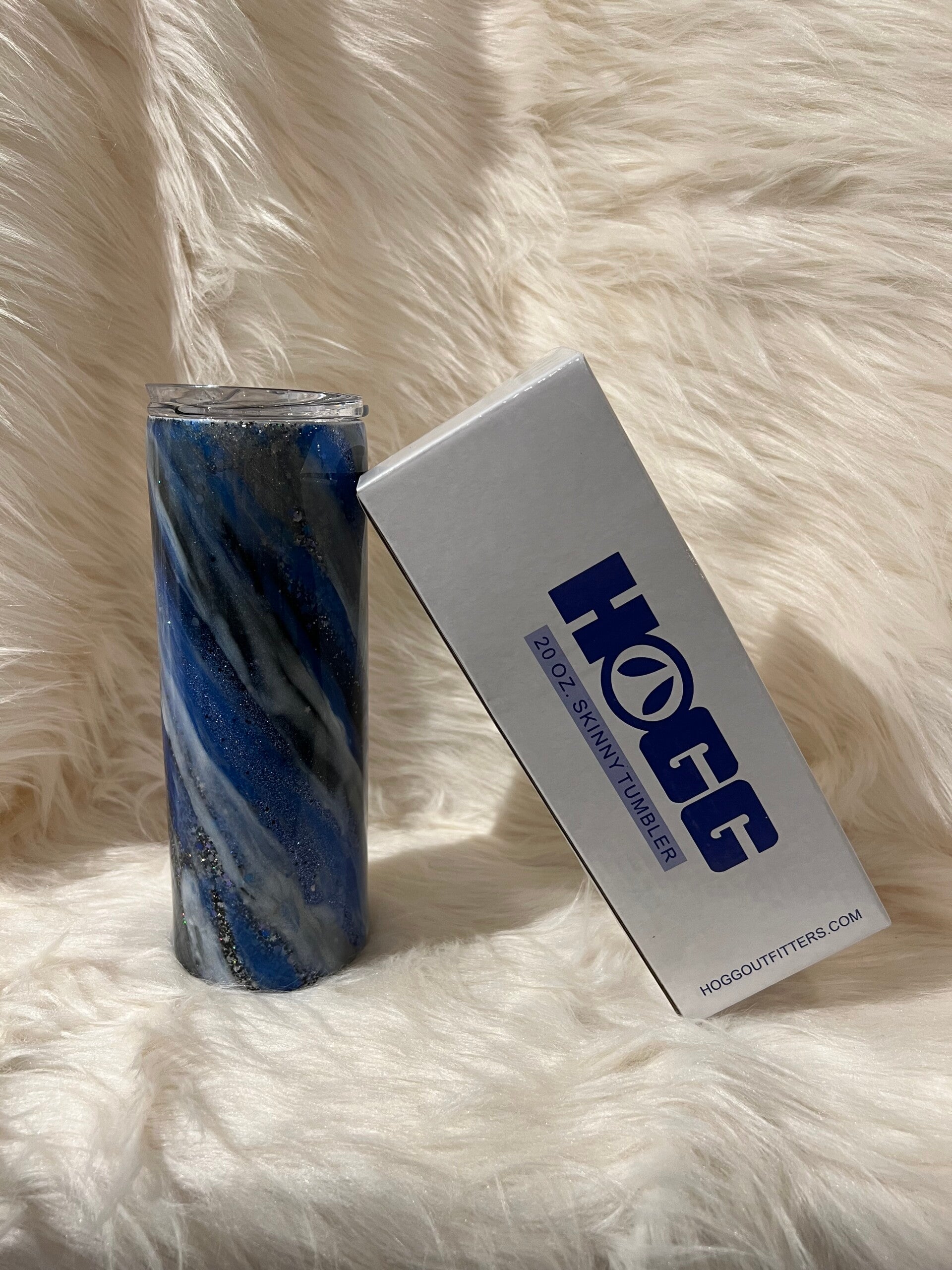 20oz skinny straightvtumbker with a chunky black and silver mix glitter, denim blue glitter and matching micas using the Milky Way technique.