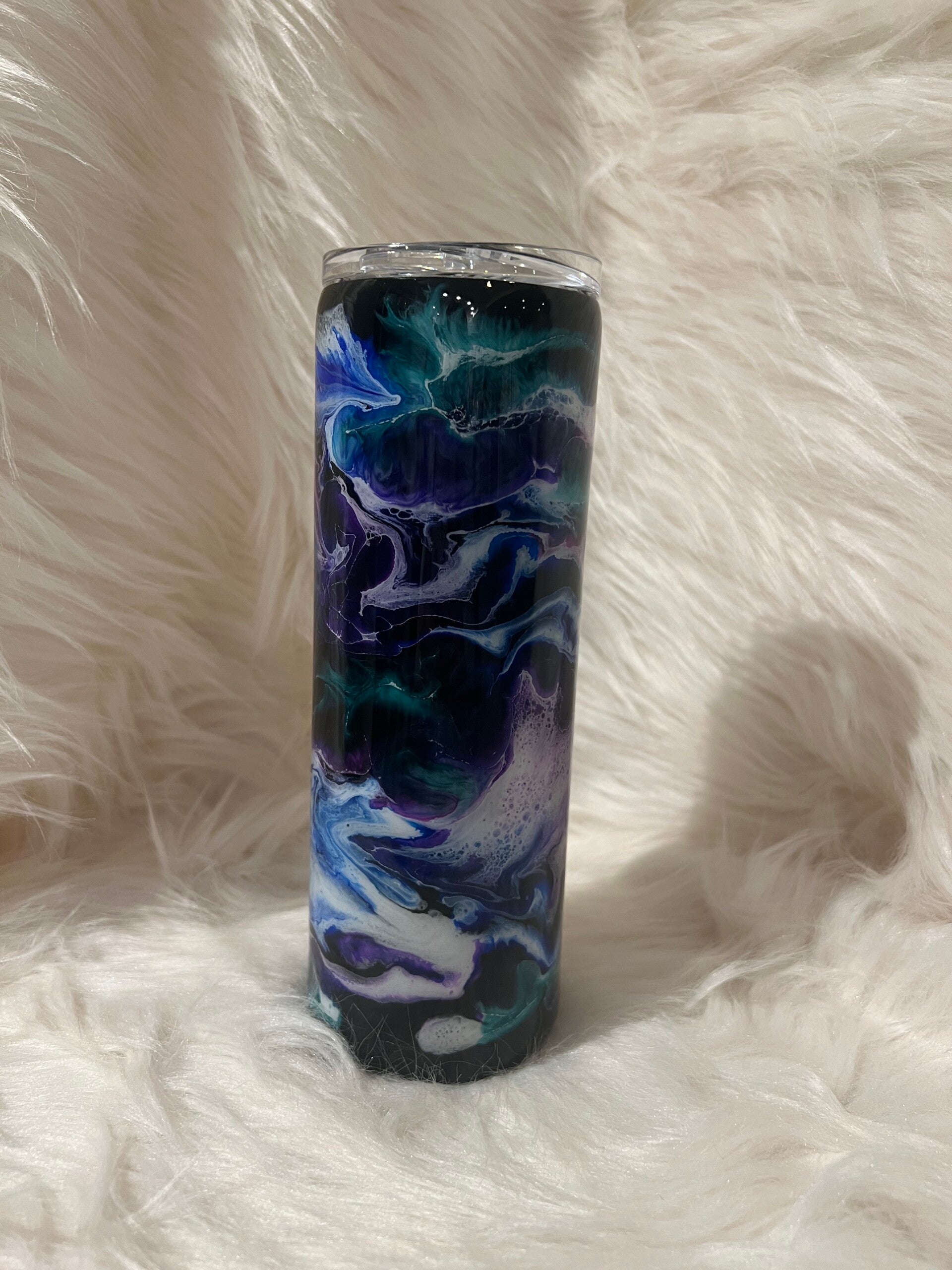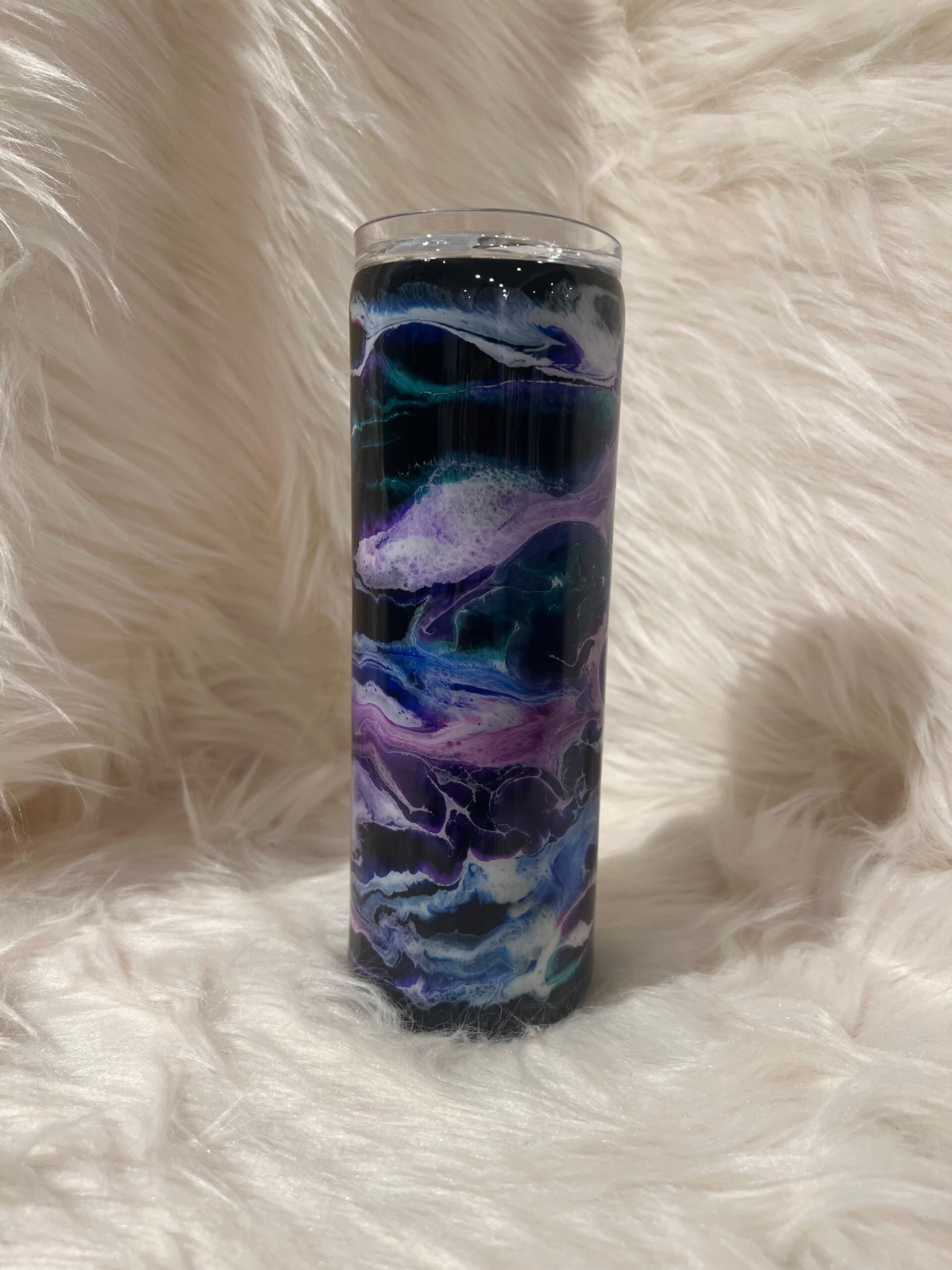 20oz Straight Tumbler with purple, blue and green swirling on a black base