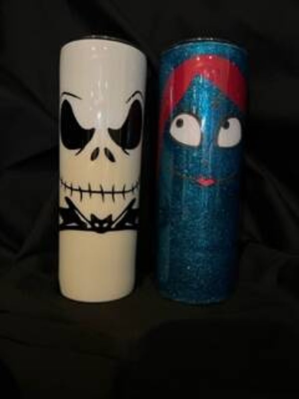 Jack Skellington and Sally 20oz tumblers. Hand-made, finished in epoxy. Can be sold seperately (see seperate listings) or as this set. Pricing on this listing is for the set. You save $10 ordering the set.
