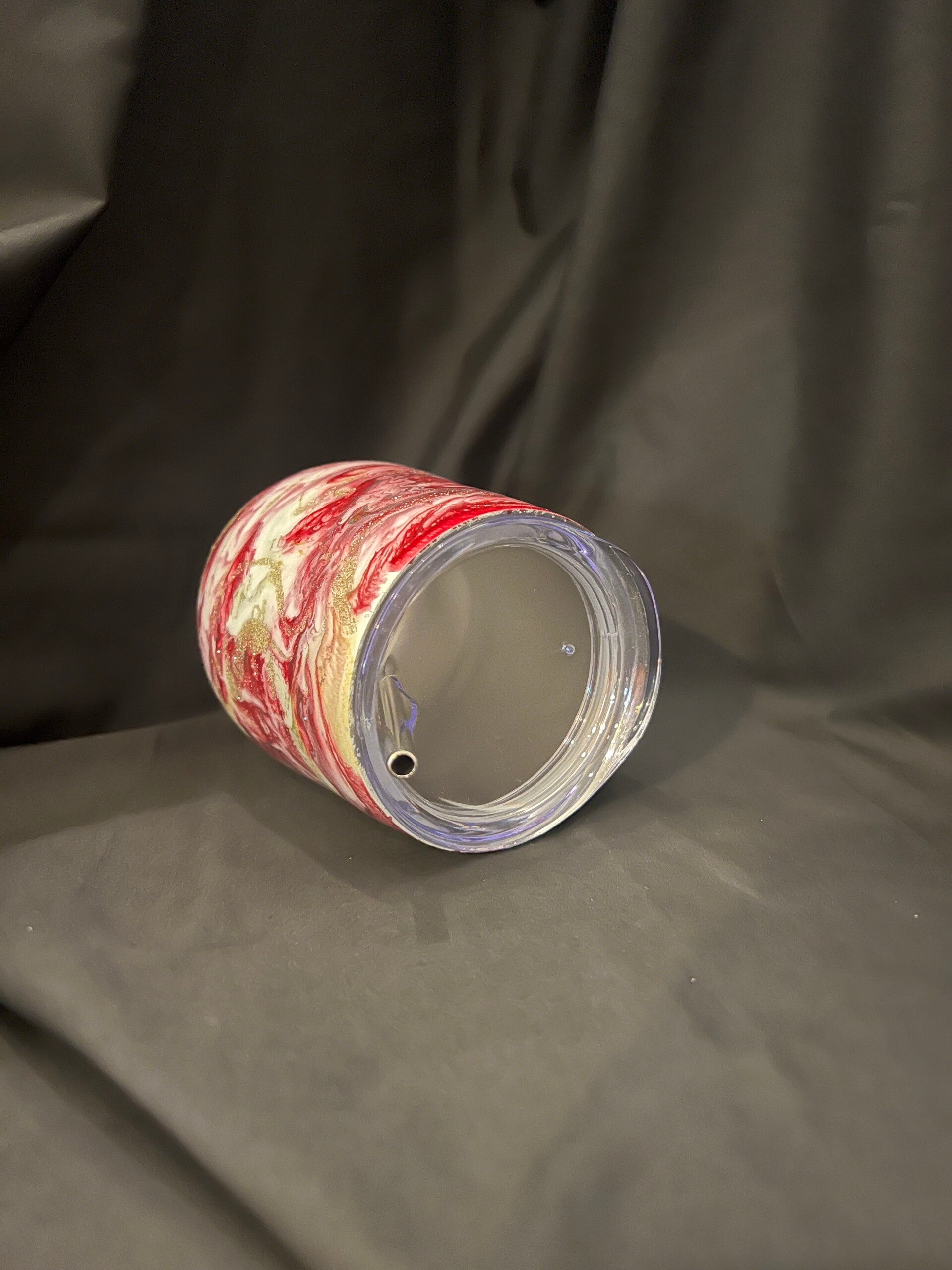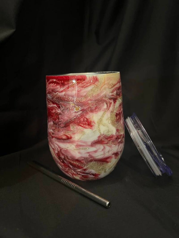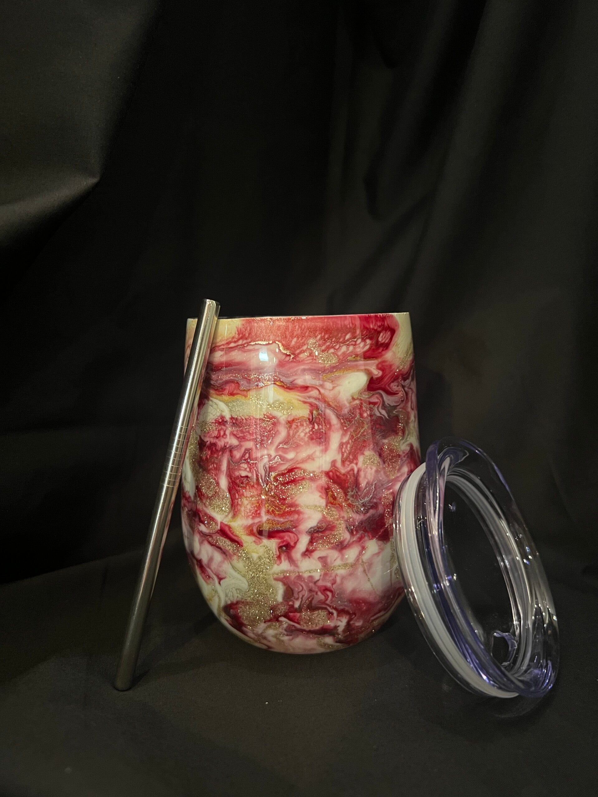 Drink your wine in style with this gorgeous red and gold wine tumbler with glitter drizzles. Handmade and finished in epoxy.