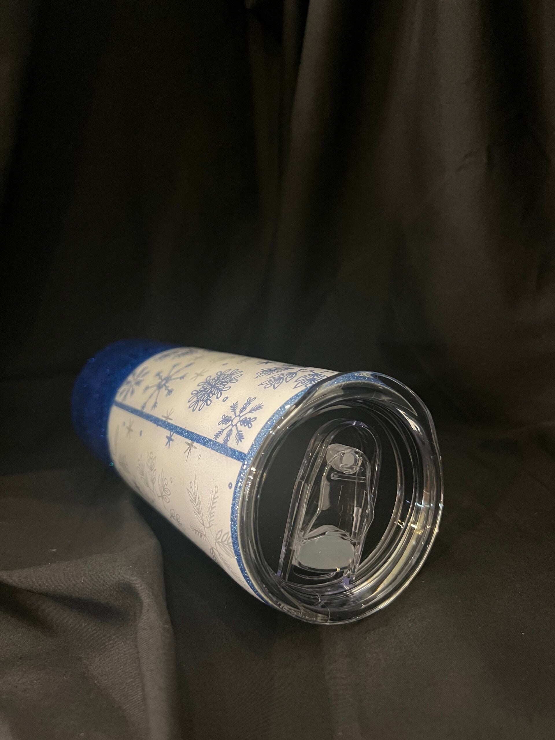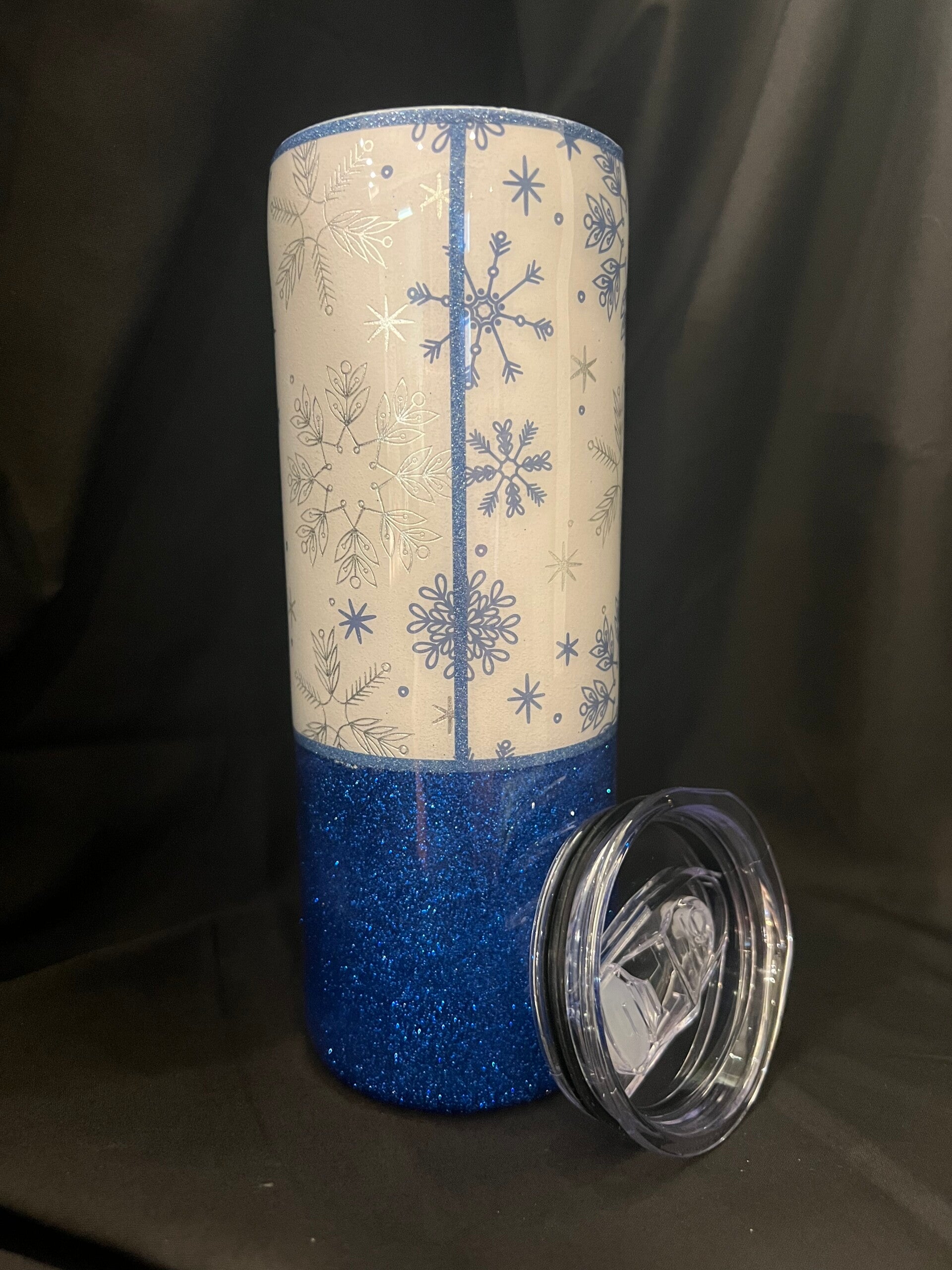 20oz skinny straight blue and silver snowflake tumbler with glitter. Perfect for hot beverages to keep you warm this winter. Can also be used for cold beverages. Handmade and finished in epoxy.