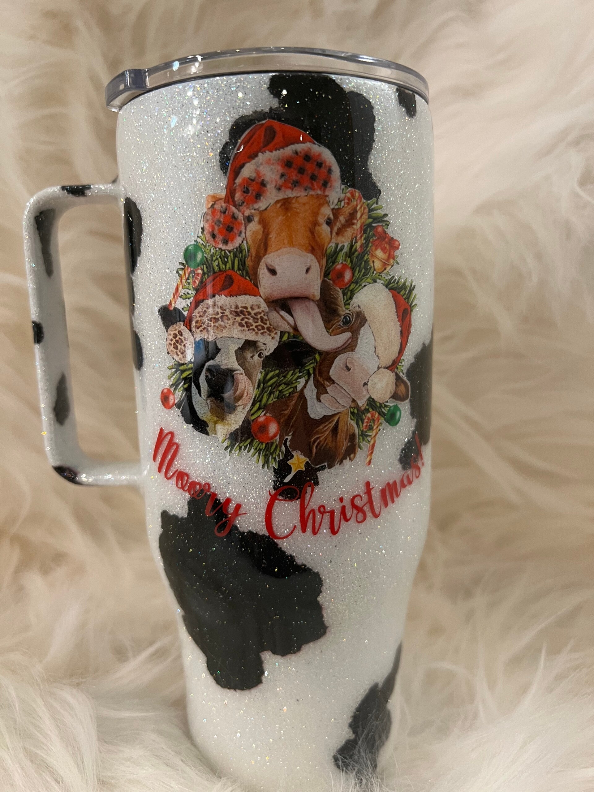 These cute cows are wishing all who see this tumbler a "Moory Christmas". Handmade, full white glitter with black alcohol ink spots. Perfect for hot cocoa or coffee on a cold Christmas morning or a cold beverage if you'd rather.